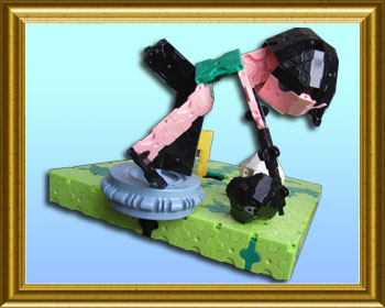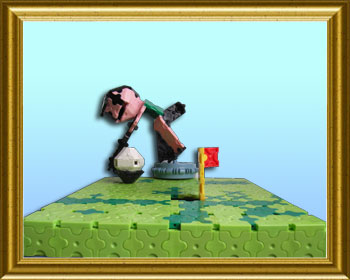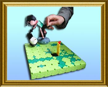 ゴルフのテレビ番組を見て、いつも見ているLaqの本を参考に作りました。選手の後ろのつまみを動かしてパットをします。(カップが小さくてボールが入りませんが、ご愛嬌ということで。