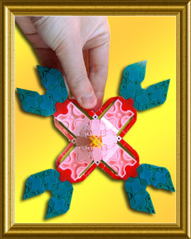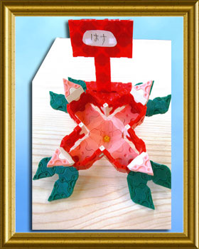 ※見るだけでなく、コマのようにまわして、はじめて完成する作品です。いよいよ3月いっぱいで卒園となるこどもたちが、毎日の中で冬から少しずつ近づいてきた春に気づき,喜んだり,『春が近づいてきたこと=大スキな友達や私とのお別れが近づいてきたこと』にさみしがったりしながら,大切な友達や先生と見つけた華を作りはじめました。(2月のおわり頃)年長になったばかりの頃は、「ここ、どうやったらいいかね?」「わからん」と、私に頼ってばかリだった子供たちが、今日見つけた花を散歩から帰るとさっそく図鑑をひらき、なまえや駒かい部分の色を確認したり、相談しあったりしながら自分達で作っていました。作っていくうちに、いろんないいことに気づき、ただの立体の花ではなく、コマのようにまわすことで、さらに本ものの花のように立体が浮かんでくる”はなのコマ”が完成しました。