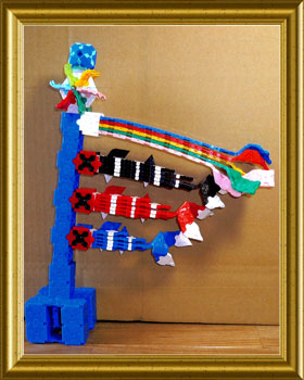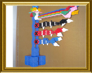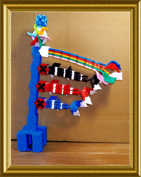 『重ねつめこみパターンに挑戦』鯉のぼりが風を受けなびき、はためくようにとピースを重ねてみましたが、やはり重さで吹流し、尾びれが垂れ下がり見栄え悪く修正するのに苦労しました。そこで?(秘)((非)かも…?)テクニック大公開(コピーの様に針金をコ形に曲げジョイントの端にある穴にさしこみバラつきをなくしました。)ピースを重ねる事により吹流しの配色がうまく表現でき、また矢車にもNo.5パーツをつなぎ回転している感を出してみました。