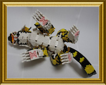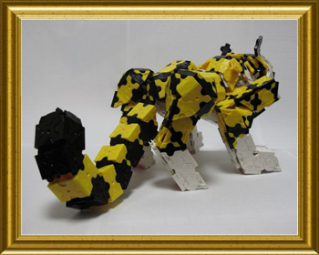 新春のお年賀を兼ねて12月作品に虎モチーフを送ります。頭部を顔とヘルメットに分割して被せてあるところがポイント。虎というよりタイガーマスクのような雰囲気。胴体部分もバイクのカウルのように上から被せています。後ろから見ると立派な虎に見えますが、正面から見るとあどけなさの残る若い虎で、どことなく幼さを感じさせます。
