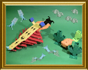 アノマロカリスが三葉虫を捕まえているところです。海綿の仲間のピラニアとボーキシアのかげにシドネイアという節足動物の仲間がかくれています。透明な生物はピカイアとオダライアとエルドニアです。