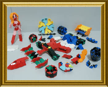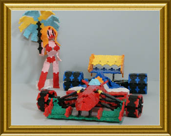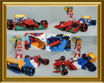 速く走る為に極限まで追求されたフォミュラーカーをla-Qでどこまで忠実に再現できるか挑戦してみました。各パーツを作っているうちに、組立式スケールモデルのようにしたら面白いかも?と思い分解した状態を撮ってみました。こだわった部分は、1.最近の主流であるハイマウントノーズと、そこから吊るされるフロントウィング、プッシュロッド式サスペンション。ラジエター前には整流版も装備。2.カラーラインの入ったタイヤは前後で直径と太さを変え、取り付け部で車高調整を可能とし、更に前輪はステアリングも可能。3.コックピット周りは、ドアミラー、メータ、パドルシフトレバー付きハンドル、バケットシート、アクセル&ブレーキペダルも装着。4.リアはエンジンへのエアーインテーク、A型サスアーム、リアタイヤ前の整流版、ブレーキランプ、リアディフェーザー、大型リアウィング、カウルの内側にはV6エンジンとそこから伸びるエキゾーストパイプを装備。特にフォーミュラーカーの特徴であるリアウィングは、なかなか納得のいく形にならず一番時間を費やしました。エアロパーツを異なる形状の物に付け替えても楽しめます。でもレースクイーンのボディラインが一番難しい・・!?