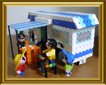 LaQの家族でキャンプにいく姿を制作しました。キャンピングカーの中で生活ができ、外でも遊べるように工夫して作りました。実際車としても動き、細かい家具とベットを決められたスペースに合わせて作るのに苦労しました。車の上の屋根の部分は子どもが遊べるようにとり外せるようになっています。