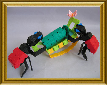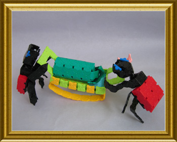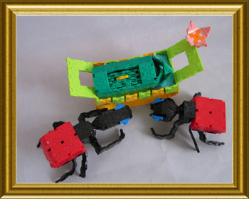 オトシブミが丁寧に葉っぱの揺籃を作る様子は感動的です。中にタマゴが産み付けられていて、成虫になるまでの栄養(葉っぱ)がぎっしり詰まった揺りかごです。その深い愛情を、擬人化して、お父さんオトシブミ(首の長い方)と、お母さんオトシブミが、揺りかごを揺らしてあやしている姿で表現しました。