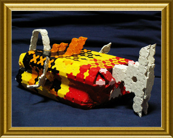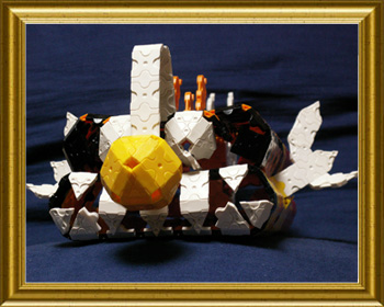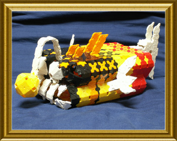 強調された大きな口とすきっ歯、ギョロリ目玉が面白いのう。ドハデな弁当箱のような体がキメ手じゃな!