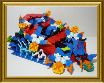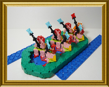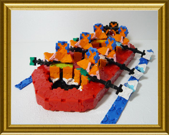 ラフティングとはラフトと呼ばれる楕円形のゴムボートで急流などの川を下って楽しむレジャースポーツでそのラフティングの各シーンをLaQで表現しました。まずはスタート地点、みんなで一斉に漕ぐシーン(赤いラフト)、次は急流を下るところで転覆するシーン、最後はみんなの力でゴールにたどり着きオールをあげて喜んでるシーン(グリーンのラフト)。ラフティングの定番、「転覆シーン」はなんだか楽しそうな感じに仕上がりました。