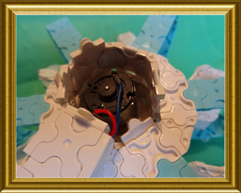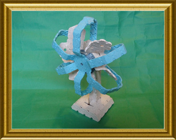 モーターを搭載して羽根が回るようにしました。台座の部分に乾電池ボックスが収納されています。電気部品は外から見えないように作りました。羽根の形を工夫して風がうまく前に吹き出すようにしました。