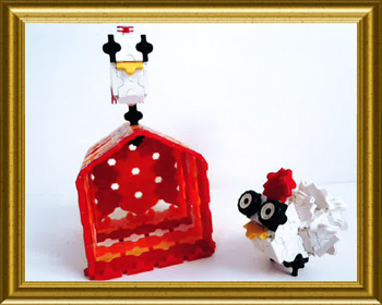 にわとりを小さい足で立たせた所と小屋の上にのせた小さいにわとり