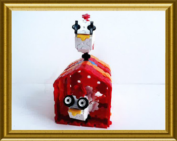 尾羽の形やミニシャフトの脚など、ニワトリの表現がとても個性的で面白いぞい。小屋の上のニワトリも愛嬌があってグーじゃ。