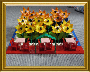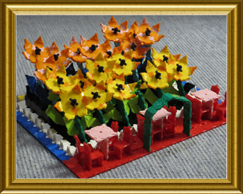 ぜんぶ同じように見える花だけど、大小や葉っぱの形が変わっています。段々飾りのように作るのが難しかったです。こんな庭で遊んでみたいな。