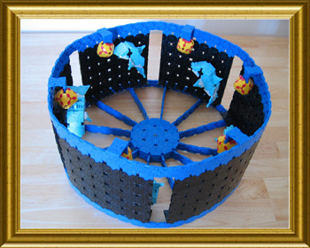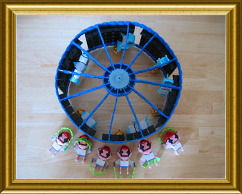 ゾートロープとは、19世紀に発明され、後の映画やアニメーションンと同じ原理で動画を見ることができる娯楽装置です。連続した静止画(モチーフ)を回転させ、スリットから覗くことにより、視覚の残像現象を生み出し、あたかもモチーフが動いているかのように見せます。LaQらしく、モチーフ(イルカショー編)は絵でなく立体で作ってみました。遊び方は、滑らかな机の上に設置し、中心のハマクロンホイールを包んだ青い部分を握り、回転させます(筒を直接回してもいいです)。ハマクロンホイールの突起部分が軸となり、遠心力でスムーズに回転します。真横から覗くと、イルカが水面から現れジャンプ、ボールをパンチし、また水面に戻る姿を見ることができます。写真なので、動いている様子をお伝えできませんが、なかなか楽しいです(子供たちも大喜びでした)。オマケに「なわとび編」を作りました。