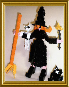 いかにも魔法使いといわんばかりの帽子と靴の形が面白いのう。腕にしがみつく必死な猫とそれを見上げるしゃがんだ猫の表情がとってもユニークじゃ。