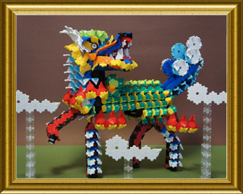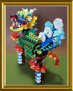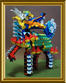 多くの色使いで極彩な麒麟を作りました。首の方向や、足の表現でバランスを取るのに苦労しましたが、鱗や尻尾の表現が面白く出来たと思います。頭から作り始めたら、ずいぶん大きな作品になってしまいました。迫力は出たと思うのですが、子供には怖がられました。