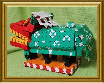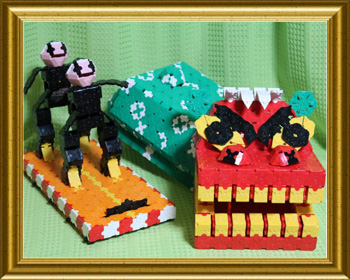 開くアゴの組み立てと体の模様・布の表現を工夫しました。中に入っている人も作ってみました。