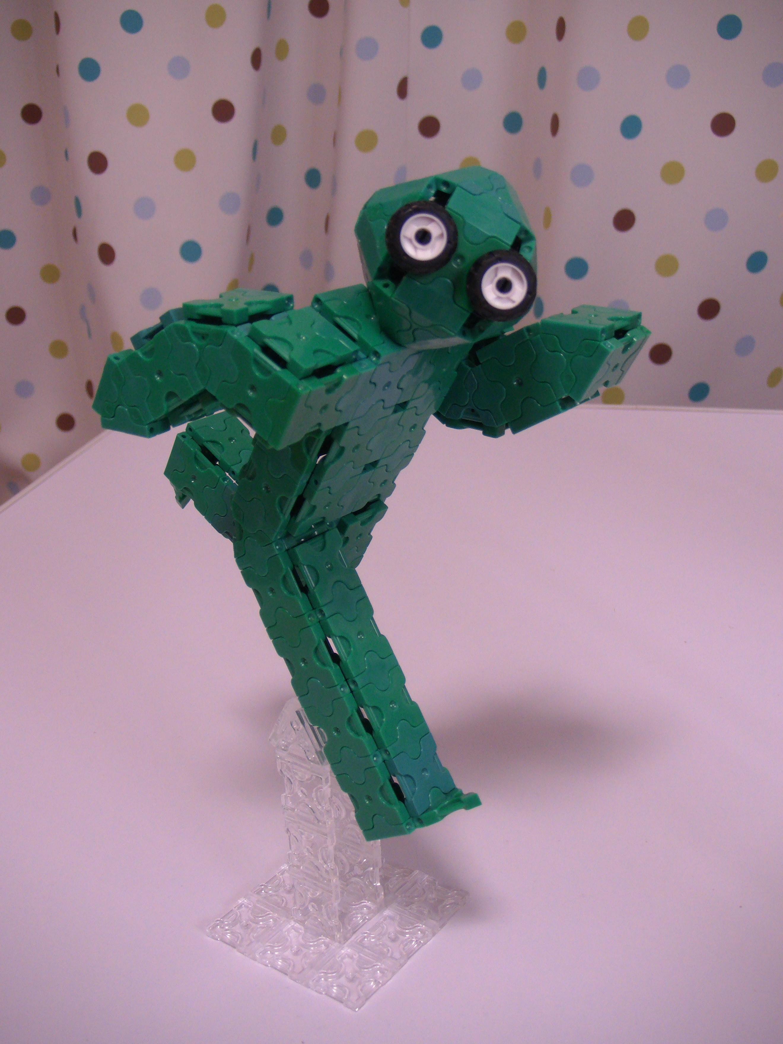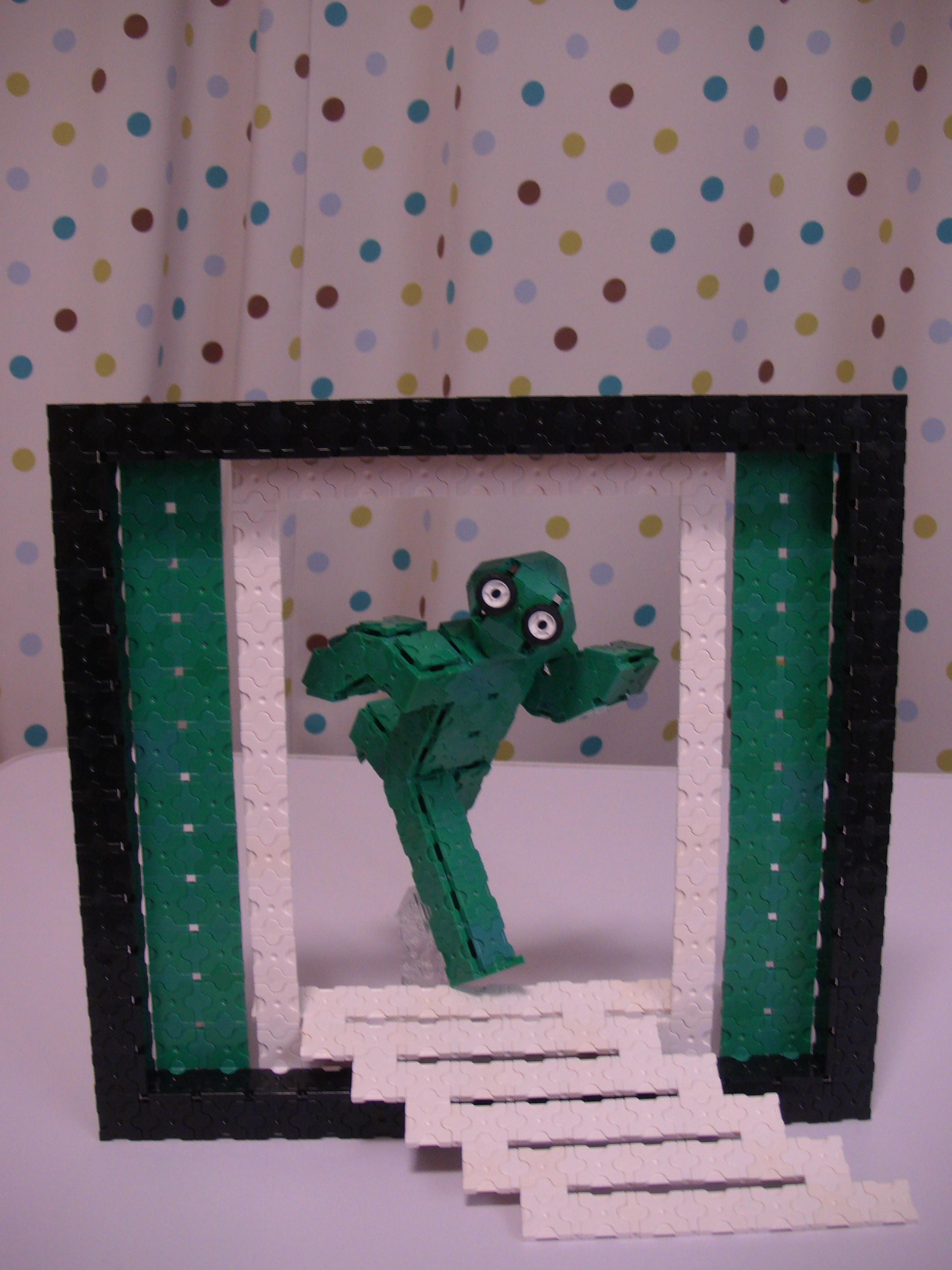 よくある非常口の標識を立体的に作りました。立体である事を利用して「非常口の人」が出るところと入るところが表現できます。標識のイラストではかわいらしい「非常口の人」ですが、緑のLaQで作ると少し不気味な感じなりました。