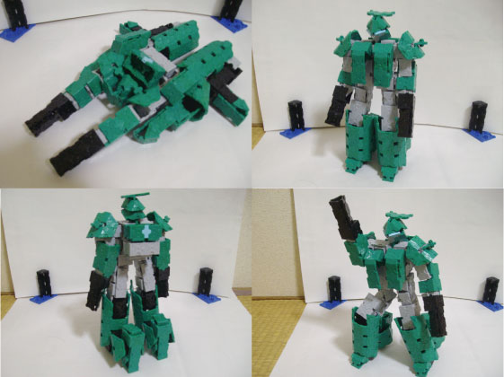 風神と雷神が、羅求合体して、巨大ロボになります。緑色のほうが風神で、青い方が雷神です。二体とも、飛行形態(?)に変形可能。今回は、いつもの倍大変でした・・・。
