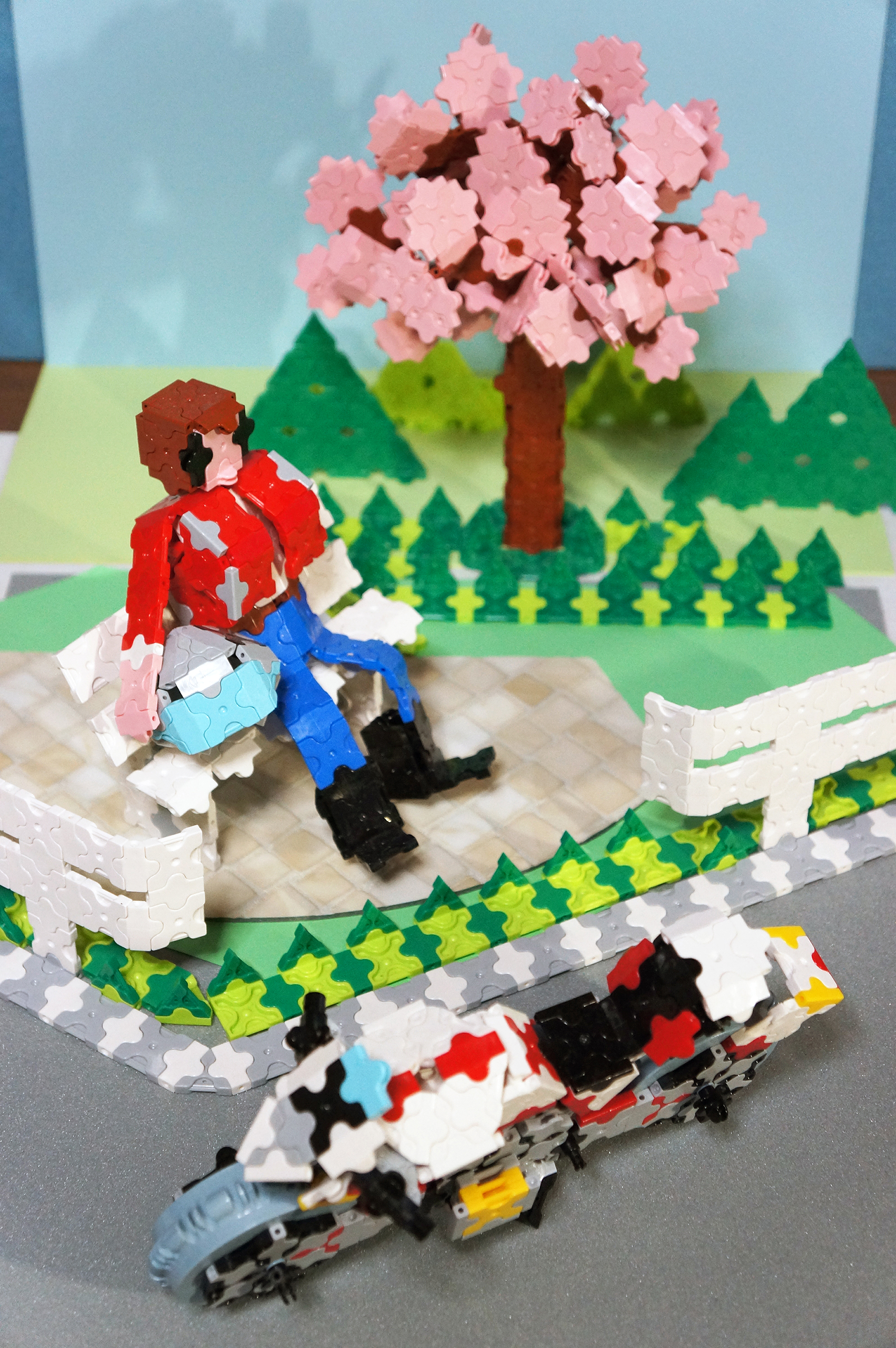 背景をぼかす撮影方法で、遠近感のある画像になるよう試みました。実際の配置は2枚目の画像のとうりです。バイクはビモータのセンターハブステア、テージ3Dをイメージしてます。