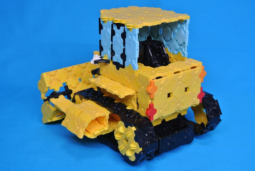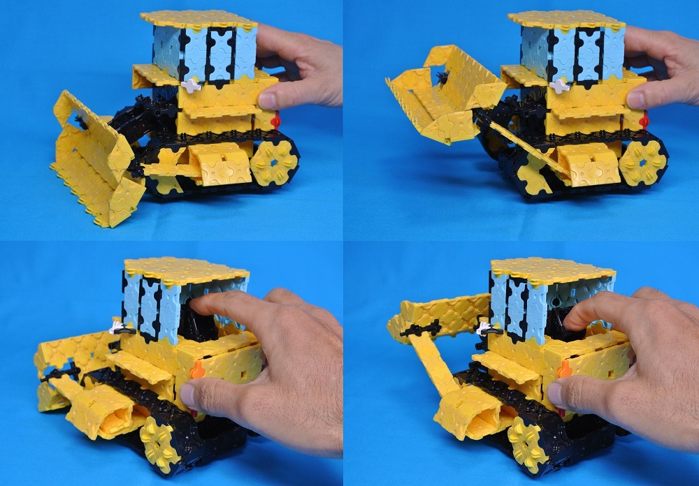 ハマクロンシャフトを使って、運転席のレバーを下げるとブレードが上がるように工夫しました。ブルドーザーの下にはハマクロンミニホイールが付いているので動かせます。