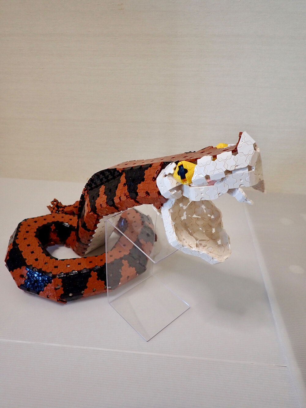 巻いたとぐろから頭をもたげて飛びかかろうとするヘビならではの動きがとても自然に組み立てられています。規則的に並ぶ三角模様やピット器官など特徴を掴んだこだわりがさらに説得力を持たせますね。(イエロー)
