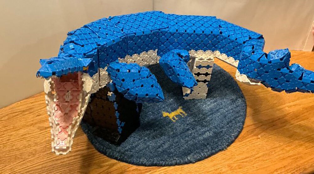 獲物を捕獲する瞬間の大きな口、うねる尻尾。本当に動き出しそうな躍動感溢れる作品です!パーツの裏面をあえて使用することでリアル感が増すだけでなく、生きているかのように表現している所がお見事すぎます!(ブルー)