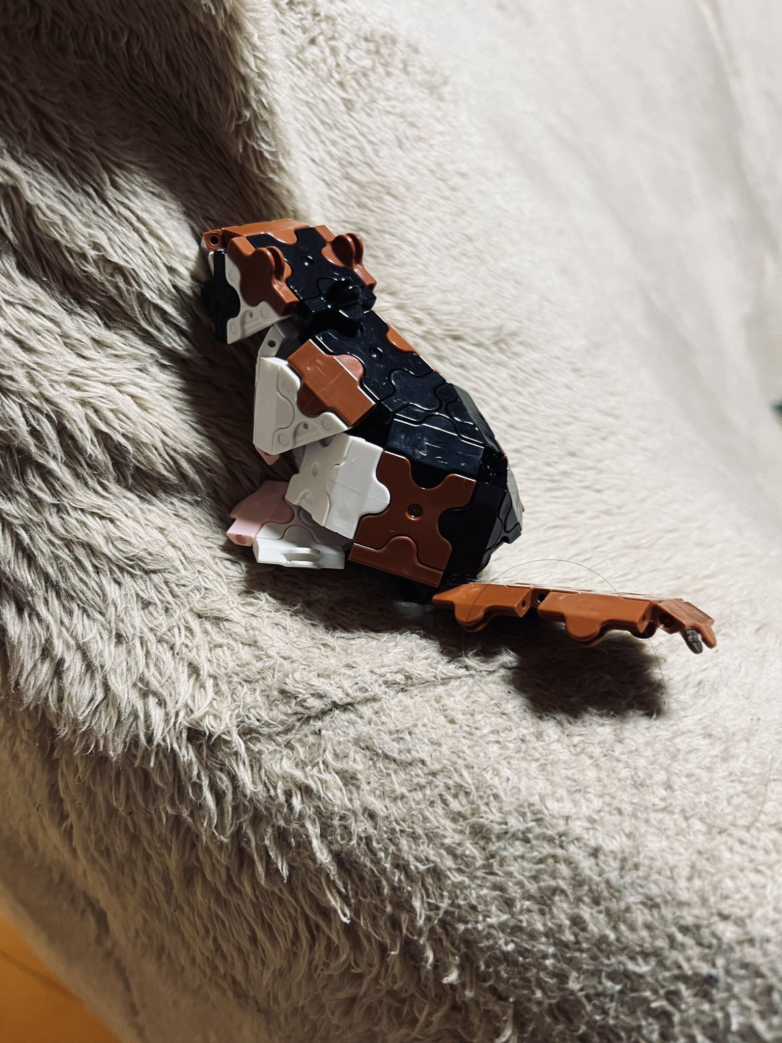少ないパーツで短い手足や丸い体などがかわいく表現されています!首や尻尾の角度を変えられることで表情が見えてきますね!(イエロー)