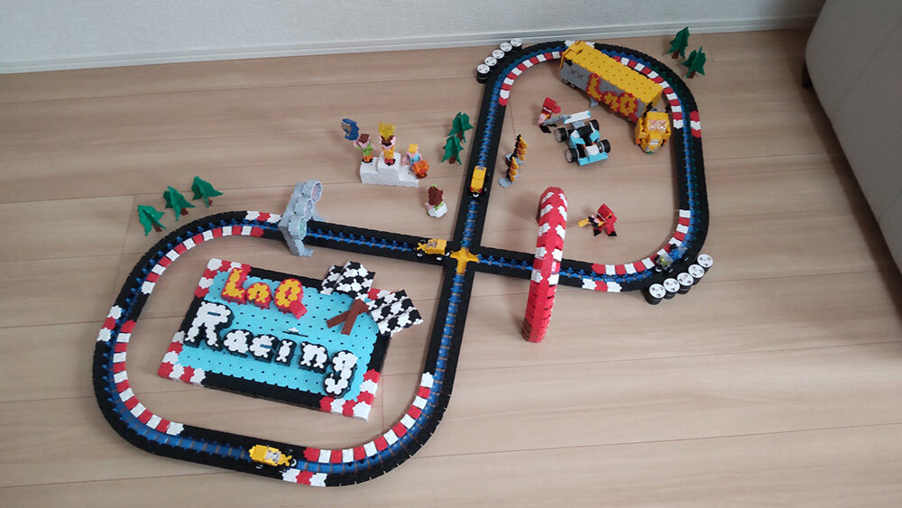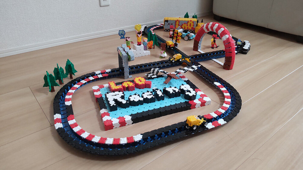 プルバックパーツを使ったギミックモデルです。前後に配置した車輪が道路の溝をつかんで、八の字のコースを高速で駆け抜けます。サーキットの情景も頑張って作りました。