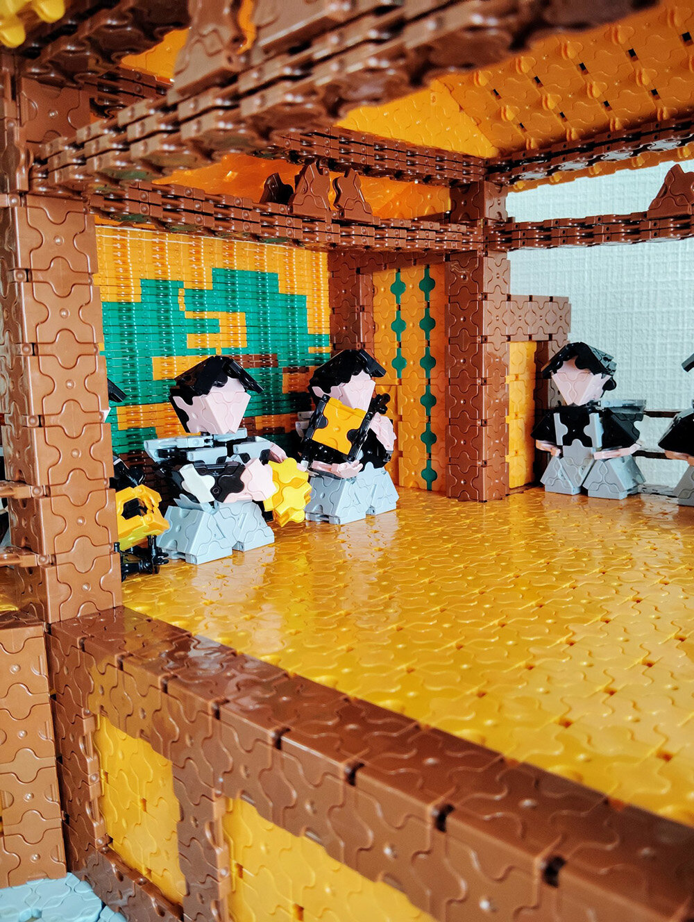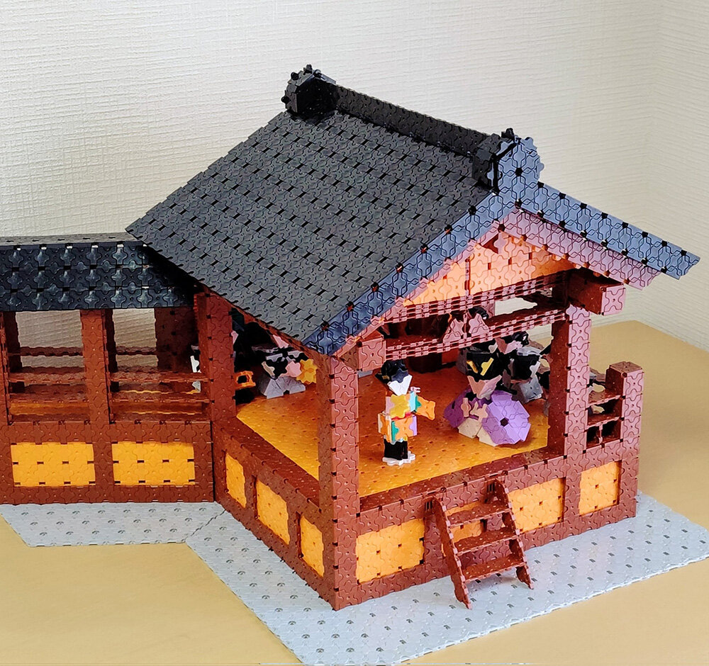 笛や太鼓の音が響き合う能舞台を作りました。松の描かれた鏡坂や柱の作りなど細部までご覧ください。それでは、ラキュー能舞台の開演です!