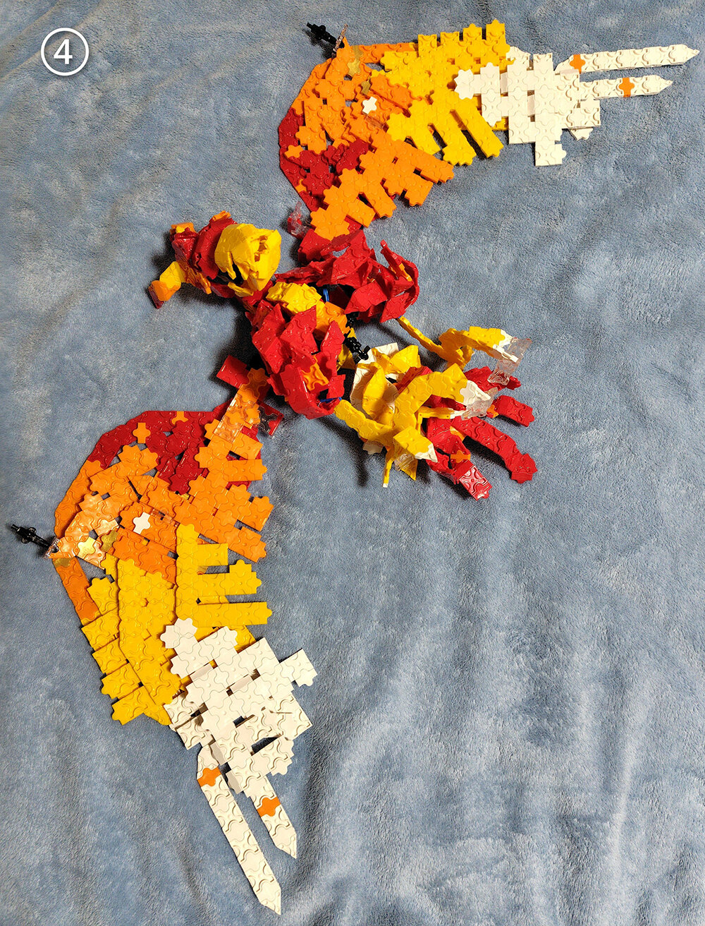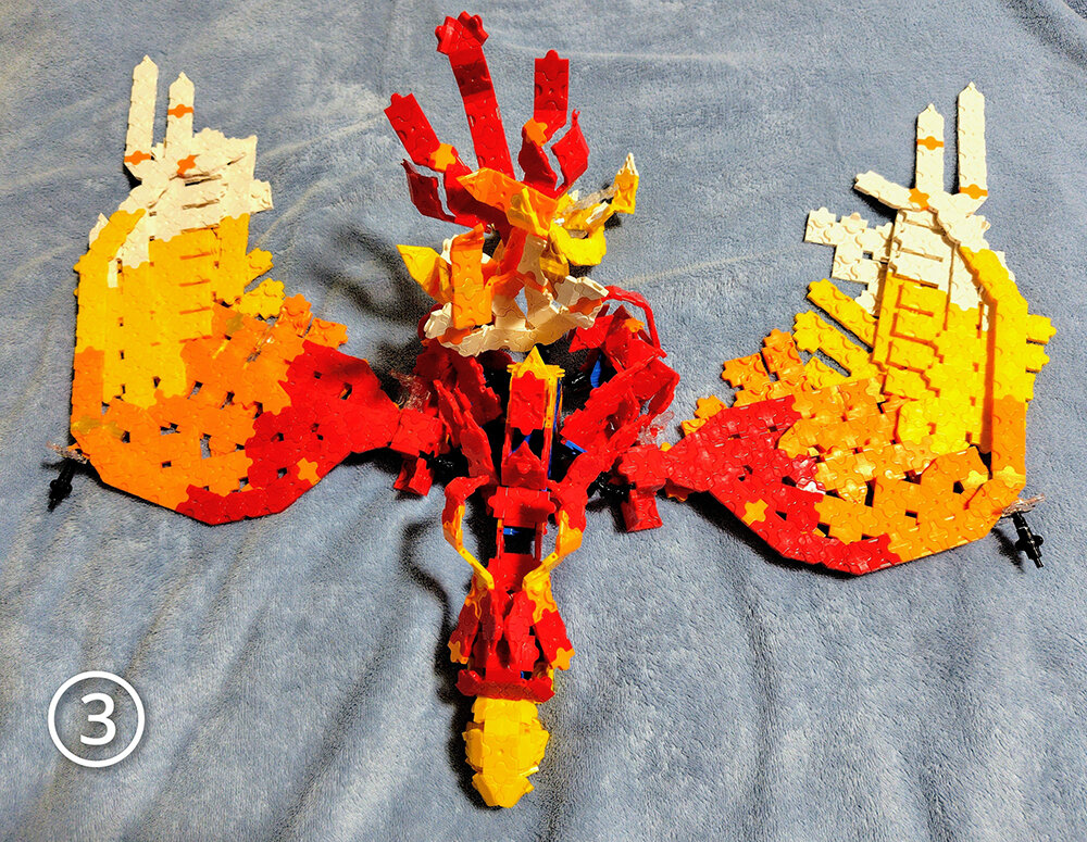 今回燃え上がる火のような体と孔雀🦚のような美しさをもつフェニックス🐦🔥を作りました。 関節はボールジョイント等を使い、羽根は五重に詰め込みました。 写真①②③は背中側、④はお腹側です。