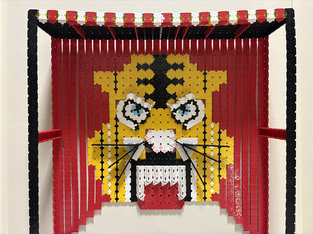 A. 背景のトラから作り始めました。迫力が出るように目、鼻、口を飛び出すように工夫しました。