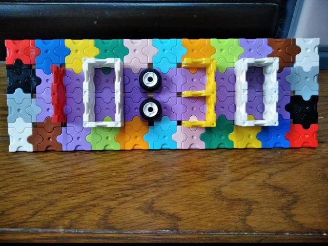 今回はデジタル時計をモチーフにした作品です。 カラフルなフレームとラベンダーのモニターとカラフルな数字を使って作りました。 時刻が進むと色が変わりスタンドはクリアパーツを使って、可愛い時計を作りました。