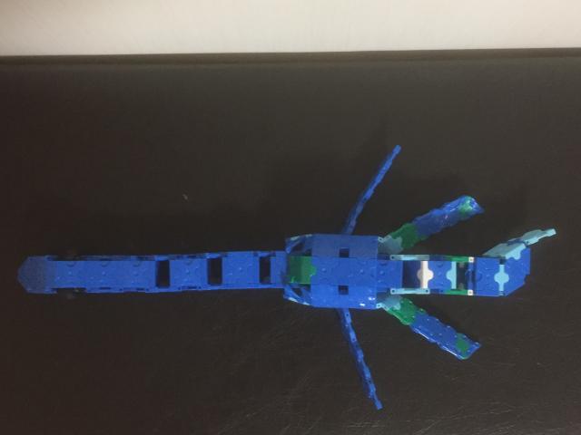 恐竜図鑑を見て、手足、首、尾などが、からだから出ているところをしっかりと見てつくりました。また、体の曲線が出るようにし、色合いも青を基調に、緑や白を所々にいれて、カッコよく見えるように考えました。