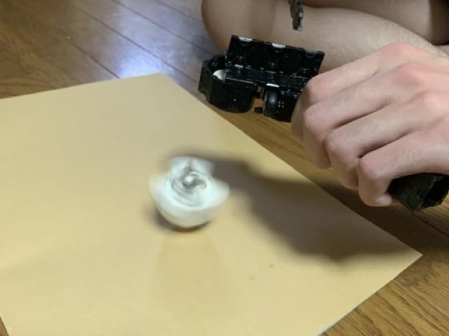 ミドルサイズホイールとミニハマクロン、No.1パーツの詰め込みで、パーツのちょうど噛み合う幅になるようにしました。ベルトを引き抜くことでミドルサイズホイールが回転し、コマに動力を与える仕組みです。コマのツメ部分は、ホイールの溝に少しズラしてセットすることで回転の際にうまく落下するようになっています。コマ本体も重みや柄などで個性を出しています。
