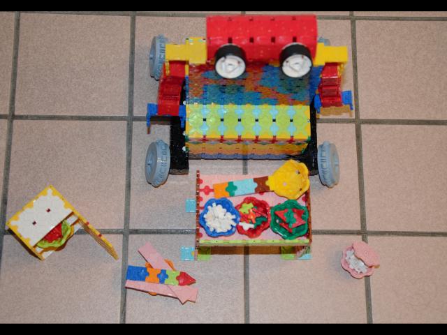 ・Robot の下の方の青い土台ところを、丈夫に作りました。曲がっていません。 ・Robotのごはんは、お米と、サラダ、イチゴ。冷蔵庫に入っているものは、刺身、シリアル。 ・ピンクの炊飯器の中には炊き立てのお米です。