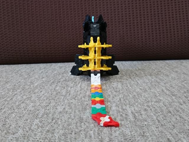 メロウンガ!は、ぼくが、ウルトラマンにこんな怪獣が出てきたらいいな、と思う怪獣を想像して作りました。口から氷の息を吹き出します。歯はギザギザしてがんじょうです。でも、顔はあいきょうがあってかわいいのがチャームポイントです。しっぽは長くいレインボーカラーで、体のバランスを取るのにも役立ちます。背中のせなびれも黄色くて黒い体の色によく映えてかっこいいです!
