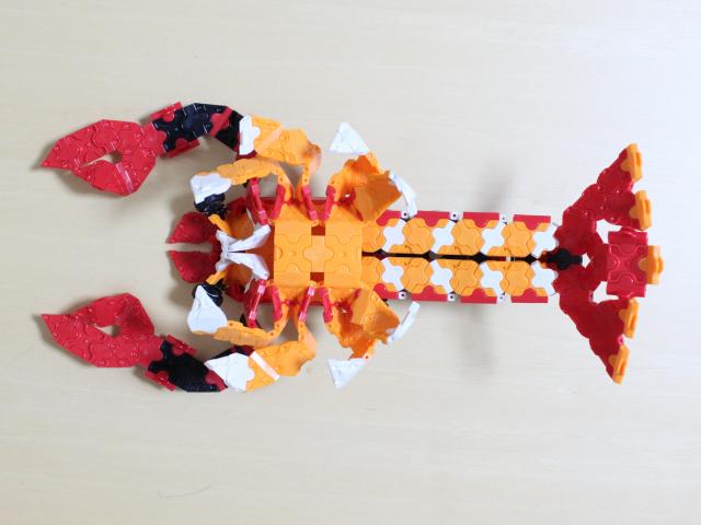 ・本物のザリガニのように腹から尾にかけて「ふにゃふにゃ」曲がって動きます。 ・口元や腹(裏側)のデザインにこだわりました。 ・パーツが段差で重なり合うようにしたり、色を赤単色ではなく黒や橙などを入れたりして、立体感が出るようにしました。