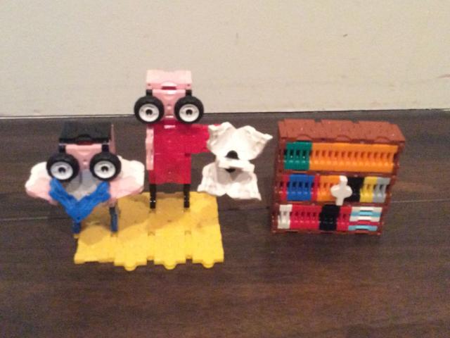 本屋で立ち読みする子供と、 その子供を叱る店主を作りました。 はたきを作るのが難しかったです。