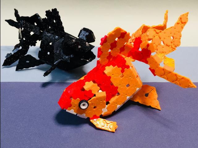 2枚目の写真は右がリュウキン、左がクロデメキンです。クロデメキンは黒い色のパーツのみで作りました。デメキンは、目が大きく飛び出しているため、「出目金」と名づけられました。