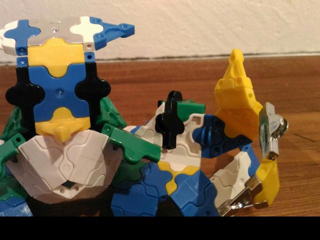 身体はカエル、顔はペンギン、手の部分はカタツムリの殻でできています。 新しい生き物を作りました。 シルバーのパーツも使って強そうにしました。