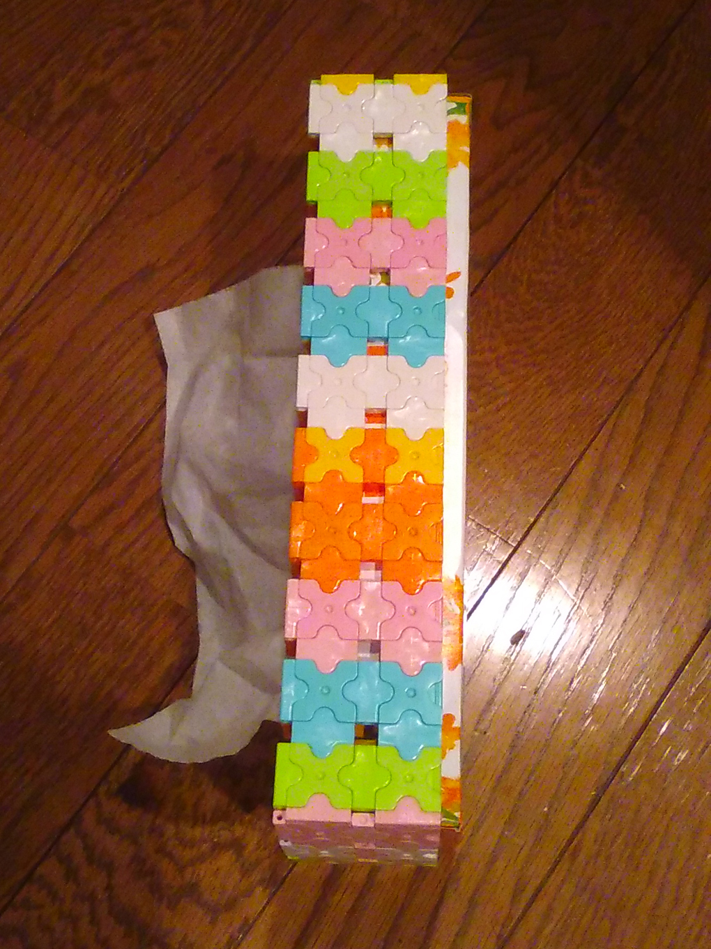 いつものティッシュボックスをLaQ で可愛くカバー。 (他の作品でパーツを使っていて足りなかったのでティッシュ取り出し口はチャックのようにしました。)
