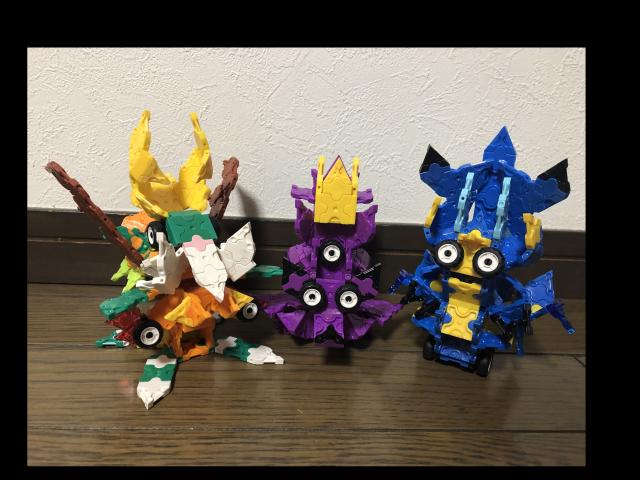 1番左の怪獣は腰にチェーンテクニックを搭載したので1段階大きくなり、トゲの部分で攻撃します。真ん中の三つ目の妖怪がリーダーなので王冠を被せて表現しました。三つ目の真ん中から電気ビームを発射します。右のロボットは足がハマクロンミニなので滑らかに動くので素早く、相手を攻撃します。クリアパーツも使用し強そうに仕上げました。全員で地球征服を目論んでいます!暗闇で生活している為、今日は足元にライトを置いてます。