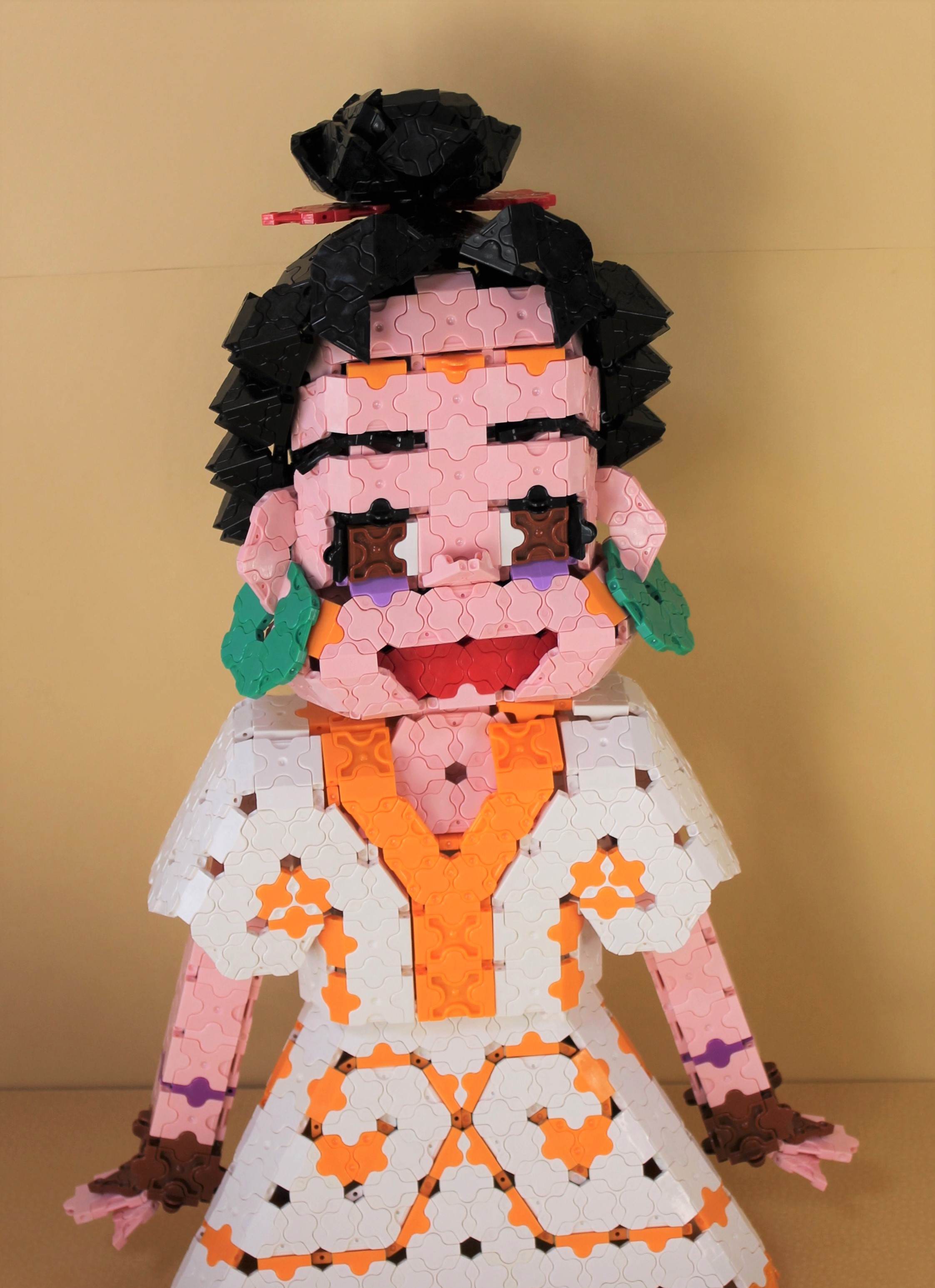 くっきり眉毛がポイントです。頭の上で結った髪はかんざしでまとめています。